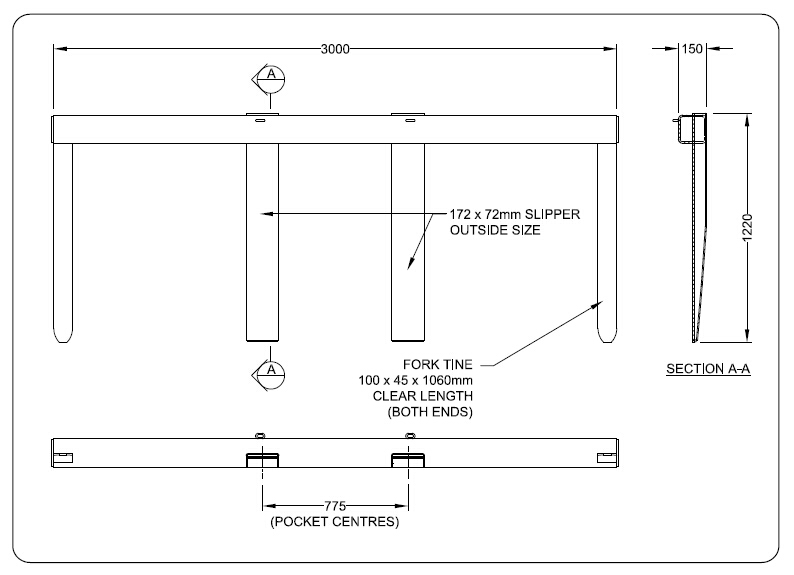 Los separadores de horquillas pueden diseñarse y fabricarse para adaptarse a su aplicación a pedido. Consulte también las especificaciones de producto del protector de carga y el esparcidor de horquilla tipo FS3-LG.